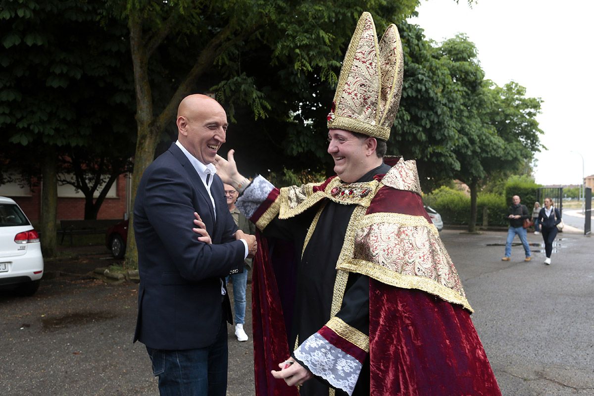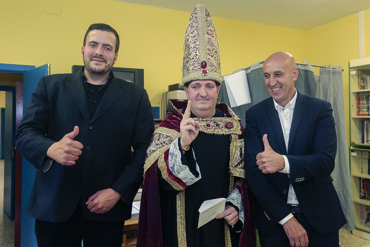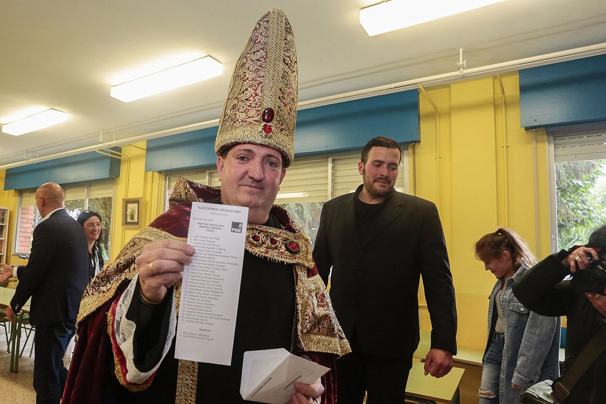 El hostelero Juan López, vota disfrazado de obispo en el Colegio Público La Palomera de León acompañado por el candidato a la reelección, José Antonio Diez