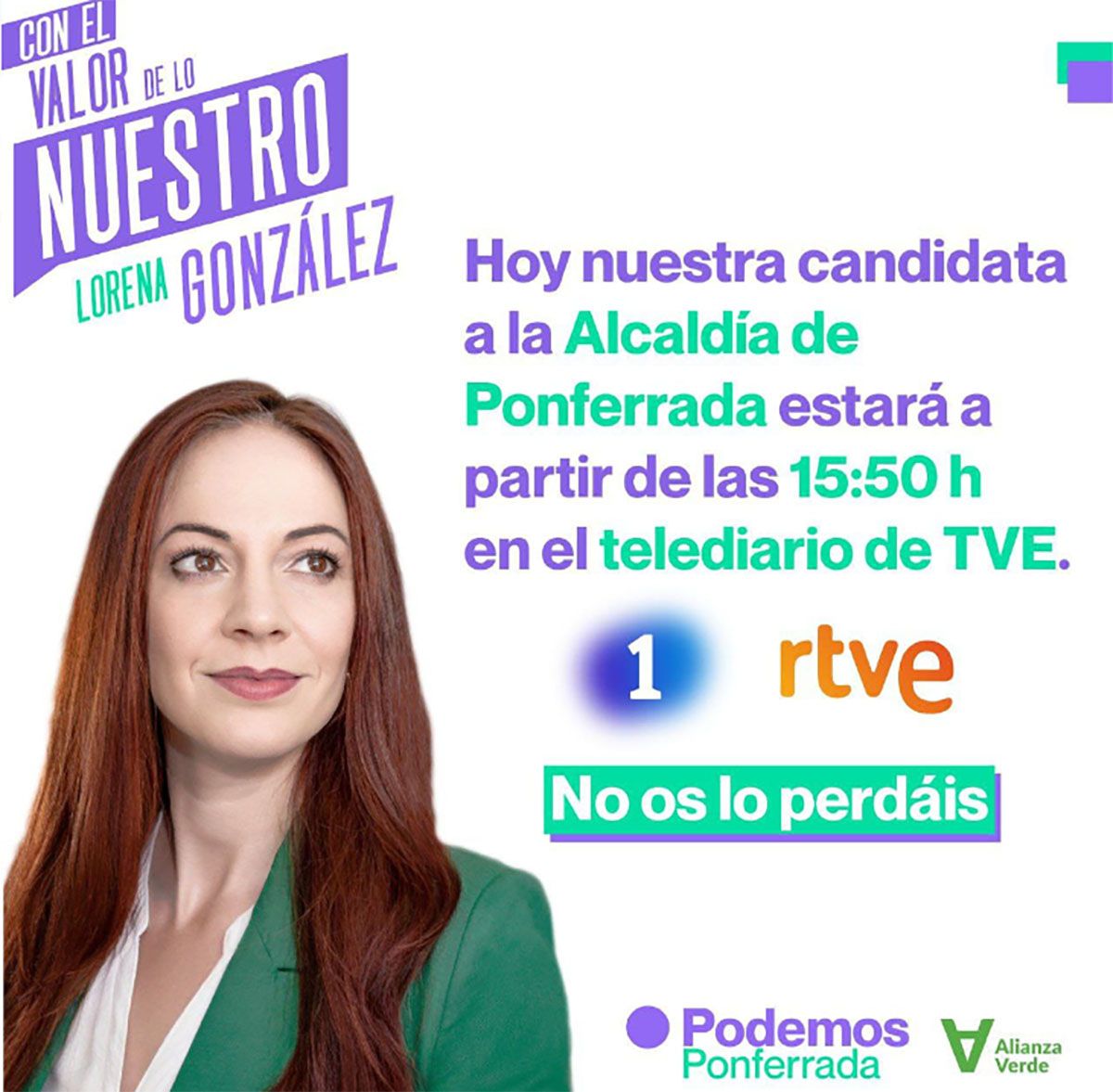 El Telediario de TVE, en su edición del mediodía, contará este lunes con la intevención de Lorena González, candidata en Ponferrada por Podemos-Alianza Verde. Concretamente, la cadena pública conectará con la capital del Bierzo a partir de las 15:50 horas, tal y como ha informado el propio partido.