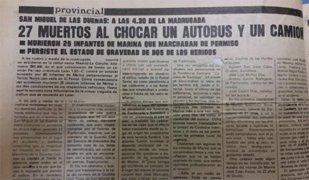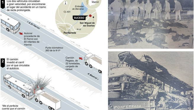 Fotografía El País 1977Hace 40 años El Bierzo vivió uno de los peores accidentes de tráfico que se recuerdan en la Provincia. Veinticinco muertos y una treintena de heridos consternaron a la Comarca el fin de año de 1977. 61 soldados pertenecientes al Tercio Norte del Regimiento de Marina de El Ferrol tomaron el autobús con destino a Barcelona para pasar con sus familias la Noche Vieja. De madrugada, a las 4.30 horas, el autocar Pegaso en el que viajaban chocó violentamente con el camión de 22 toneladas 'Transporte Ignacio' de Ponferrada cargado de cebada. El kilómetro 380 de la carretera general de Madrid a A Coruña a su paso por San Miguel de las Dueñas se convirtió en escenario del drama. "Un horrendo espectáculo de los que quedan para siempre grabados en la mente", escribía entonces el cronista de ABC.