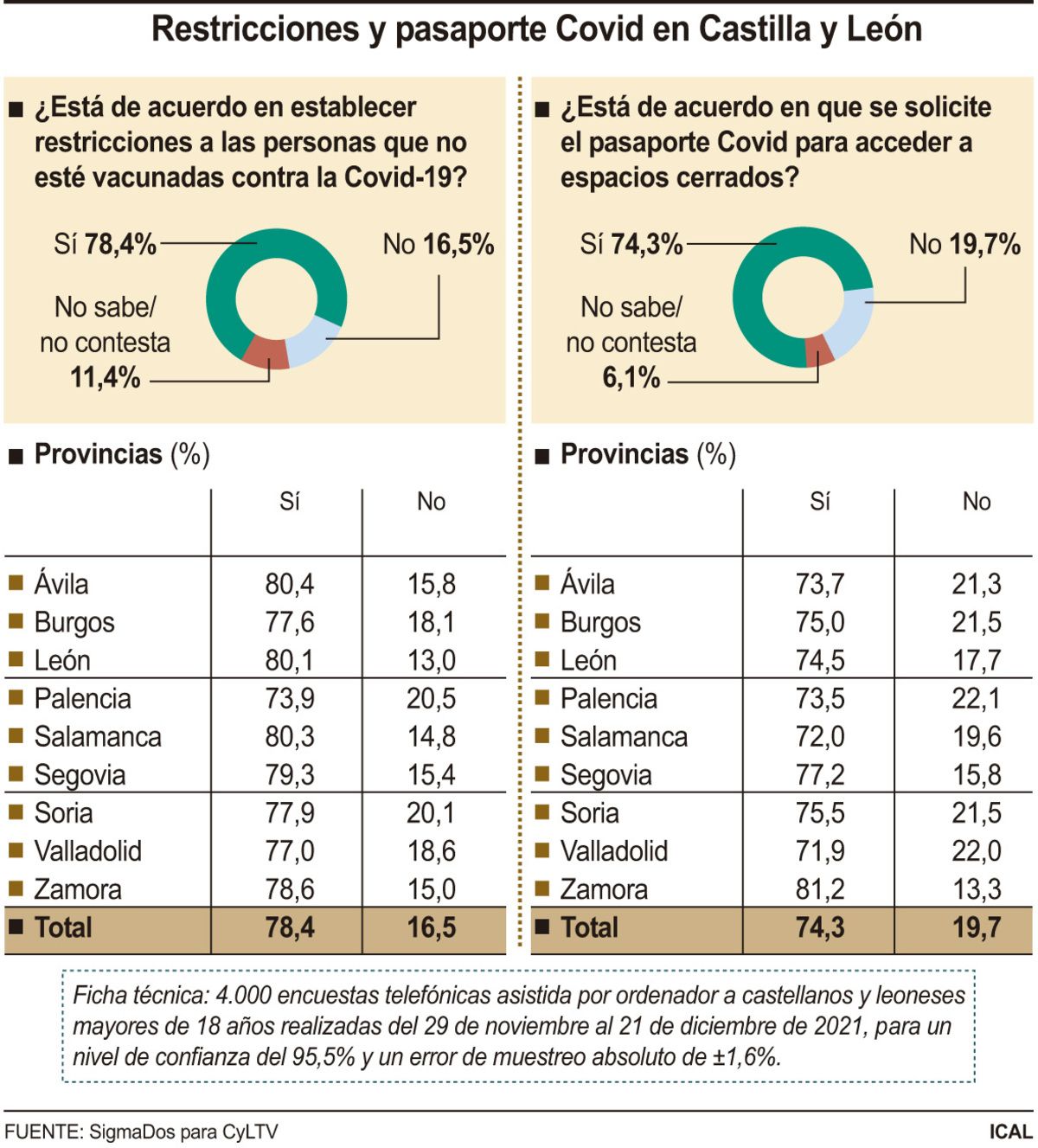 Restricciones y pasaporte Covid en Castilla y León (10cmx11cm)El 78,4 por ciento de los castellanos y leoneses está de acuerdo con que se establezcan restricciones a las personas que no estén vacunadas contra la COVID-19, frente al 16,5 por ciento que opina lo contrario, tal y como indican los datos registra-dos en el barómetro de Sigma Dos para CyLTV coincidiendo con el cierre del año. En estos términos, cabe destacar que el 80% de los leoneses están a favor de aplicar medidas restrictivas para las personas no vacunadas.