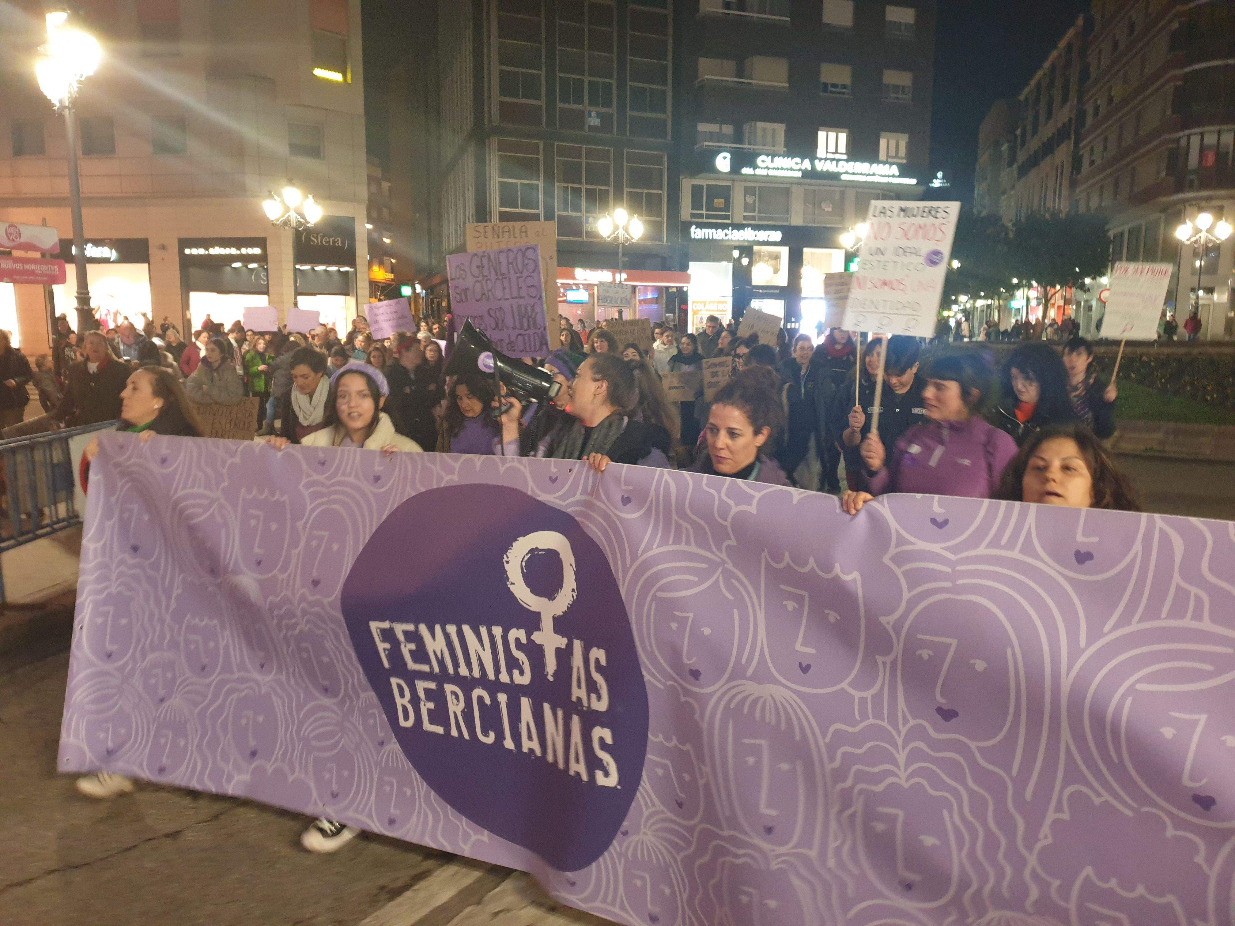 Una parte del movimiento feminista del Bierzo se ha manifestado este miércoles desde la Plaza de Lazúrtegui hasta la Plaza del Ayuntamiento. En la última convocatoria del 8M las mujeres asistentes y aliados han caminado juntas al 'ritmo' de las ya míticas proclamas del movimiento: '¡Que viva la lucha de las mujeres!'.