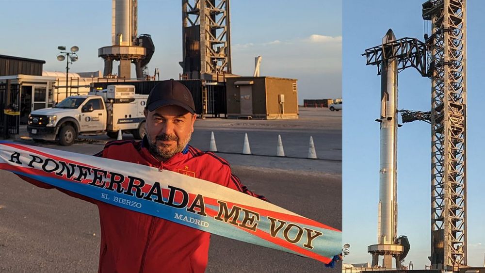Una fotografía que ha sido compartida por la peña blanquiazul "El Oso y el Botillo", formada por seguidores de la Ponferradina afincados en la capital española. "Estamos presentes hasta en el lanzamiento del Starship de SpaceX", señala la peña futbolera en su cuenta de Twitter.