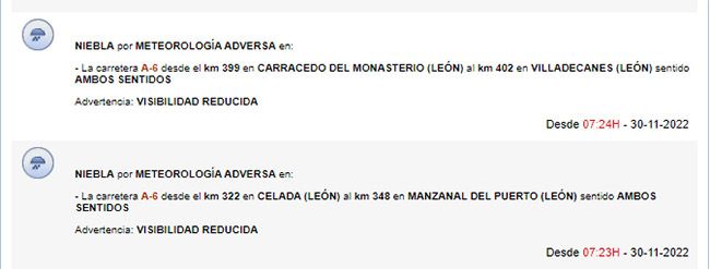 Niebla en el BierzoEn concreto, la niebla está afectando a la A-6 entre Carracedo del Monasterio y Villadecanes , entre Celada y Manzanal del Puerto (León), entre Paradores de Castrogonzalo (Zamora) y San Martín de Torres (León), en Tordesillas y en Medina del Campo (Valladolid).
