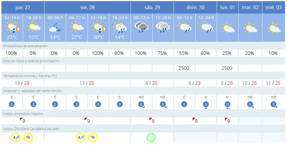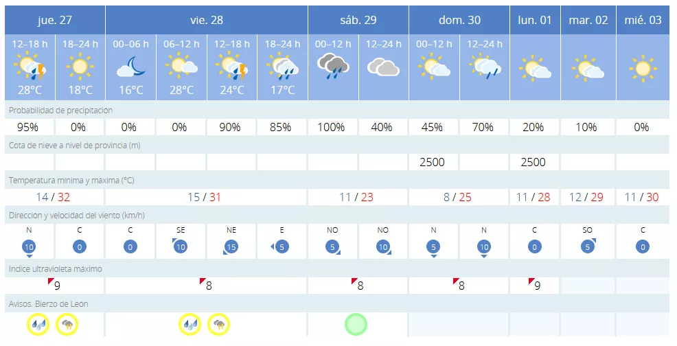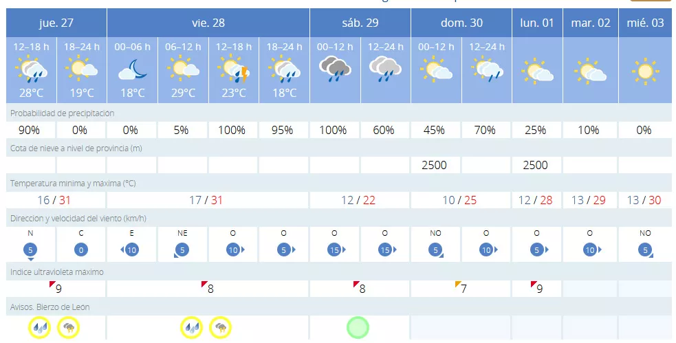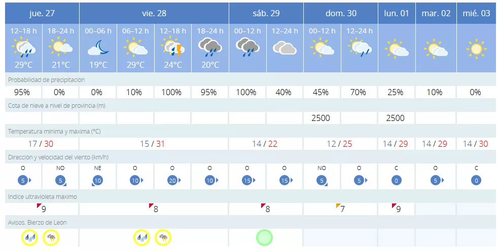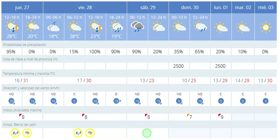 La Villa del Burbia también establece el aviso amarillo hasta el viernes, aunque se espera que las tormentas protagonicen el sábado y el domingo. Así, las máximas de más de 30 grados del jueves y el viernes, dejarán paso a máximas de entre 23 y 25 grados el 'finde'.
