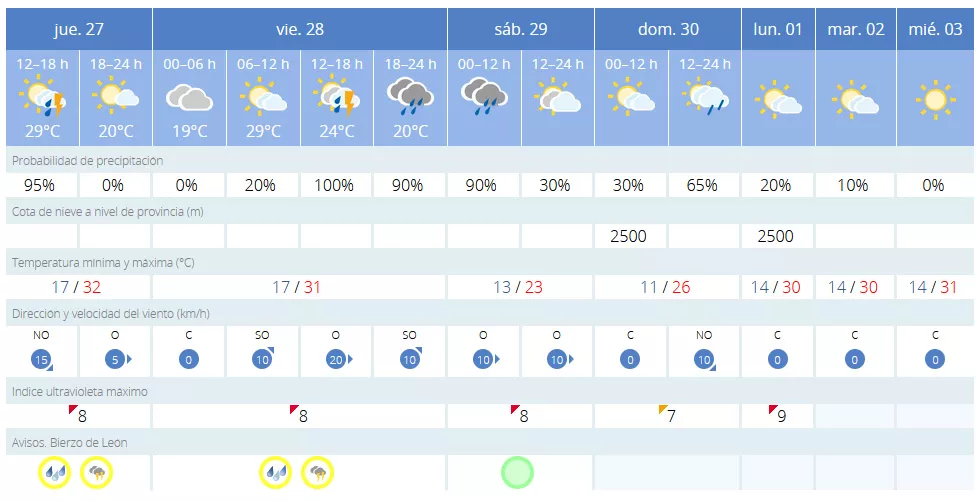 Fabero también tendrá activa hasta el viernes el aviso amarillo por fuertes tormentas y lluvias, así como máximas de más de 30 grados y mínimas de 15. El fin de semana los termómetros se desplomarán unos 10 grados de media, pero persistirán las tormentas.