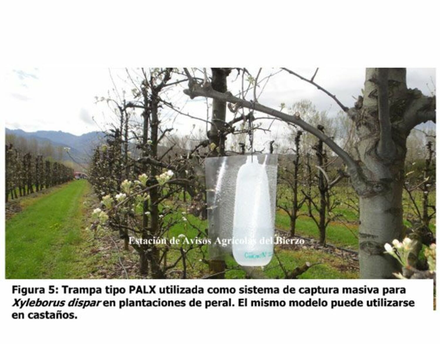 Ahora es el momento de instalar trampas para el control de este insecto. Pueden utilizarse trampas cebadas con alcohol. Las trampas deben colocarse antes del inicio del período de vuelo de dispersión que comienza cuando las temperaturas diurnas comienzan a alcanzar los 20oC, aproximadamente en febrero o principios de marzo en función de la meteorología. Este sistema puede utilizarse tanto en perales como en castaños.