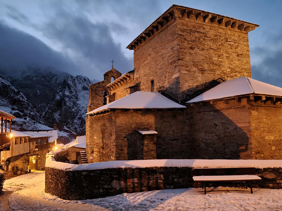 Otra de ellas la 'subía' a Facebook La Cantina de Peñalba, y recoge la iglesia con el Valle del Silencio al fondo. La nieve se funde con las luces ténues del pueblo. Una delicia.
