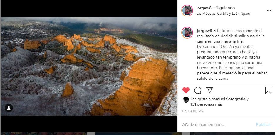 La primera de ellas, del fotógrafo Jorge W8,que se ha viralizado en pocas horas en Instagram. La imagen lo dice todo. El monumento natural más reconocido del Bierzo, pintado de trazas blancas. Aquí tienes el acceso al perfil del genial Jorge, con otras muchas "fotazas" del Bierzo.