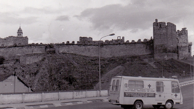 ICAL . Una de las antiguas unidades móviles de extracción de la Hermandad de Donantes de Sangre del Bierzo junto al Castillo de los Templarios de Ponferrada