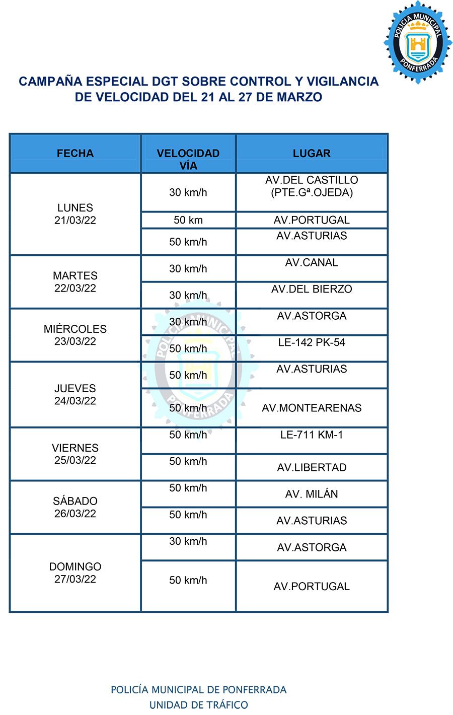 Durante la próxima semana -del 21 al 27 de marzo- la Policía de Ponferrada controlará la velocidad a 30 y 50 en distintas vías de la capital berciana. Así,