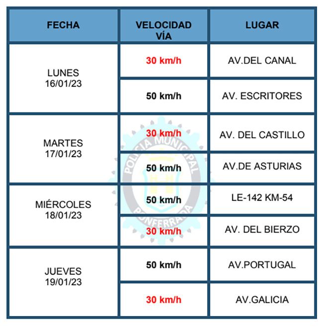 La Policía de Ponferrada ha hecho públicos los puntos donde estarán controlando el tráfico la próxima semana. Así, el lunes 16 estarán controlando que los vehículos circulen a 30km/h en la Avenida del Canal y a 50 en la Avenida los Escritores; el martes a 30 en la Avenida del Castillo y a 50 en la Avenida de Asturias; el miércoles a 50 en la LE-142 en el kilómetro 54 y a 30 en la Avenida del Bierzo; y finalmente, el jueves en la Avenida Portugal a 50 y en la Avenida Galicia a 30.