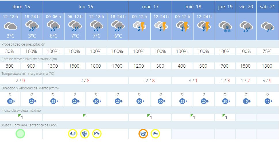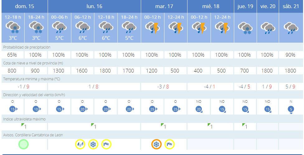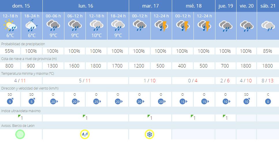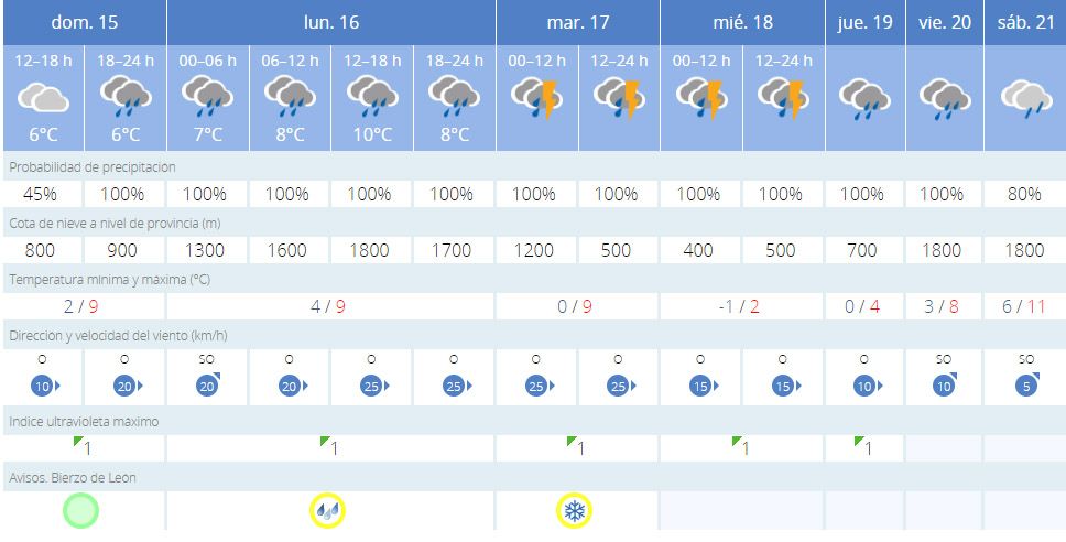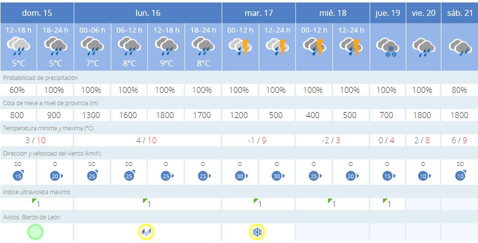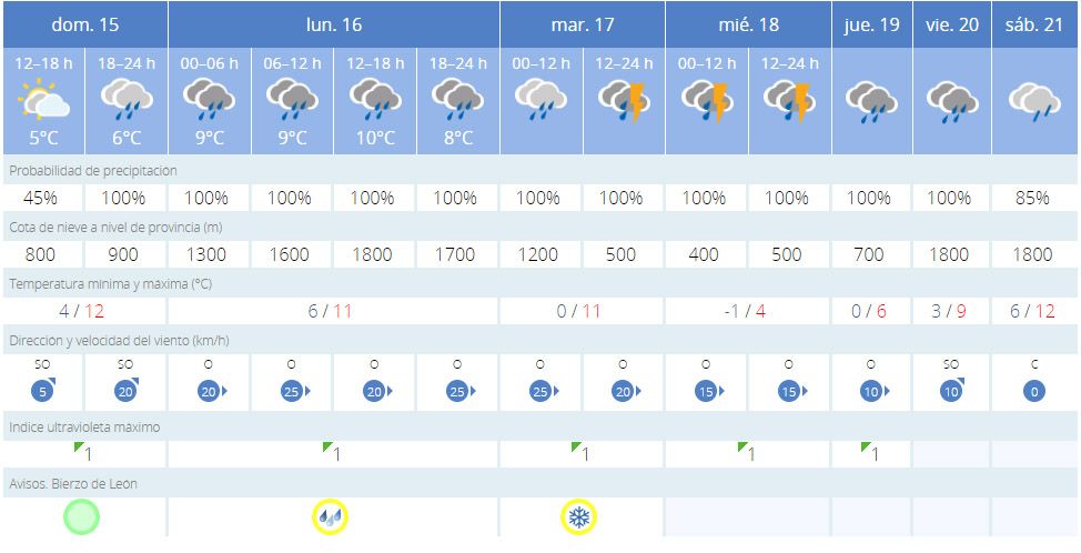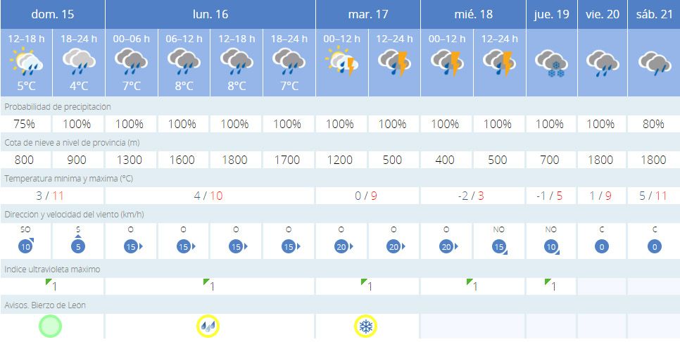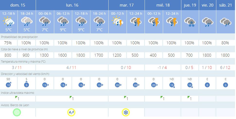 En la capital berciana el aviso amarillo por nieve se inicia el martes y para el miércoles la temperatura se moverá en el rango de 2 a -1 grados centígrados. La cota de nieve se desploma a 400 metros y se mantendrá entre los 500 y 700 para la jornada también del jueves.