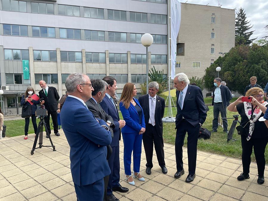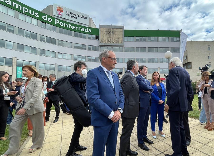 Las autoridades esperan en la puerta del Campus de Ponferrada la llegada del monarca. En la foto se puede ver al alcalde de la ciudad, Olegario Ramón, al presidente de las cortes de Castilla y León, Carlos Pollán, el presidente de la Junta, Alfonso Fernández Mañueco, la subdelegada del gobierno en Castilla y León, Virginia Barcones, el rector de la Universidad de León, Juan Francisco García Marín y Luis del Olmo.
