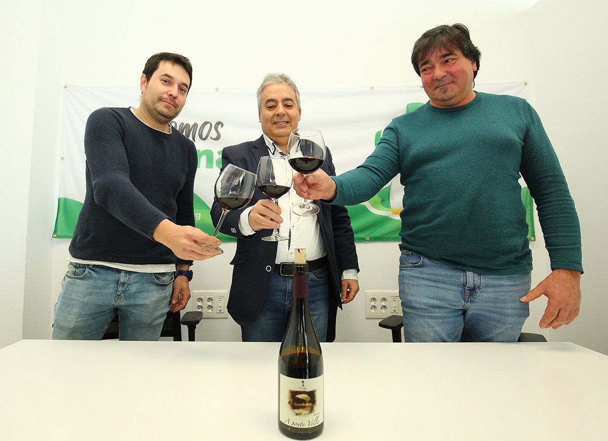 El director general de Asprona Bierzo, Valentín Barrio (C), junto a los responsables de la bodega 13 Viñas, Julio Calvo (I), y Jesús Alcaide (D), durante la presentación del proyecto Aspronawine