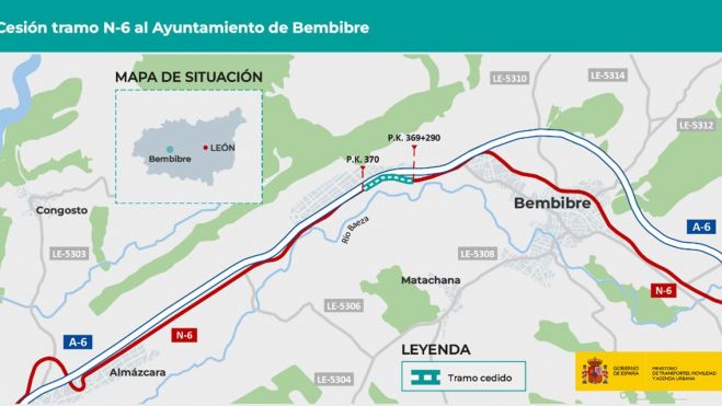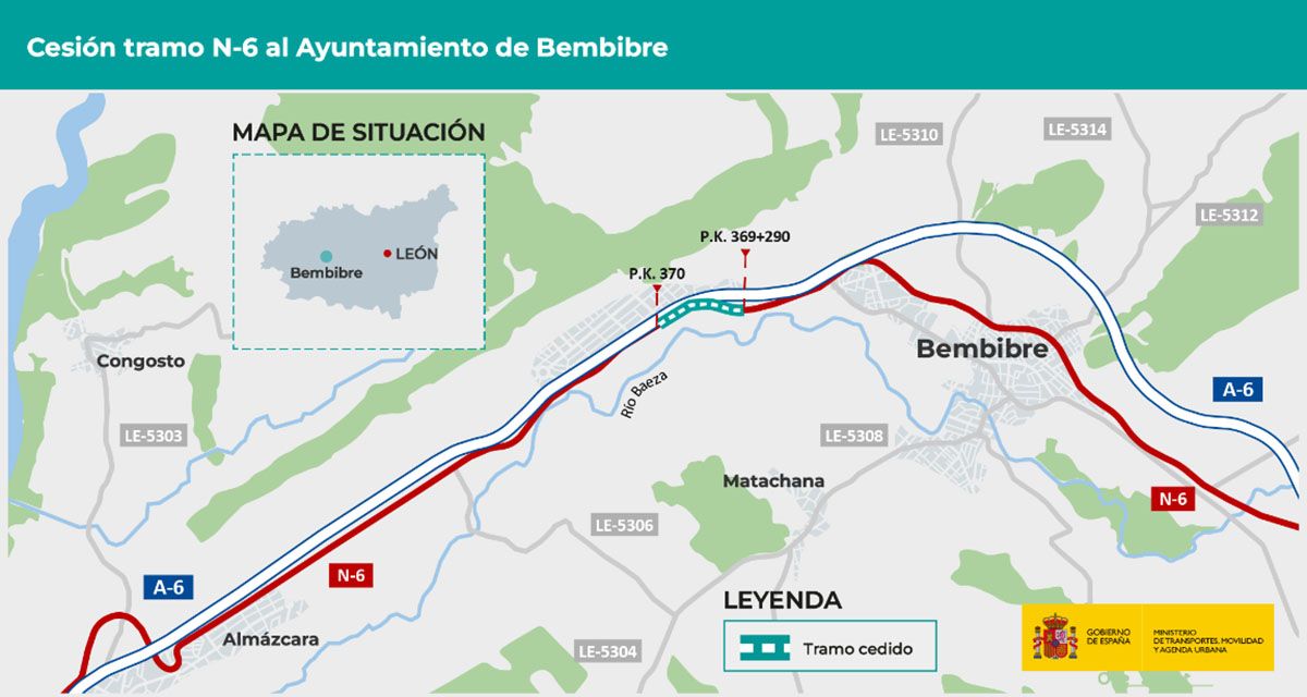 El Ministerio de Transportes, Movilidad y Agenda Urbana (Mitma) ha cedido la titularidad de un tramo de la carretera N-6, que se extiende entre los kilómetros 369,290 y 370, al Ayuntamiento de Bembibre. La longitud total transferida es de 722,83 metros, con una superficie de 33.731,34 metros cuadrados.