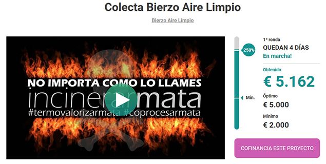 La 'Colecta Bierzo Aire Limpio' comenzó en febrero con el objetivo de recaudar un mínimo de 2.000€ en la primera ronda y hasta 5.000€ en la segunda ronda, que no ha sido necesaria, todo ello en base a pequeñas aportaciones, 'gota a gota', desde 5€ a 100€, con recompensas simbólicas, como bolsas y camisetas. “Curiosamente —informa Bierzo Aire Limpio— la mayoría de los donantes han sido tan generosos que incluso han renunciado a la recompensa”.