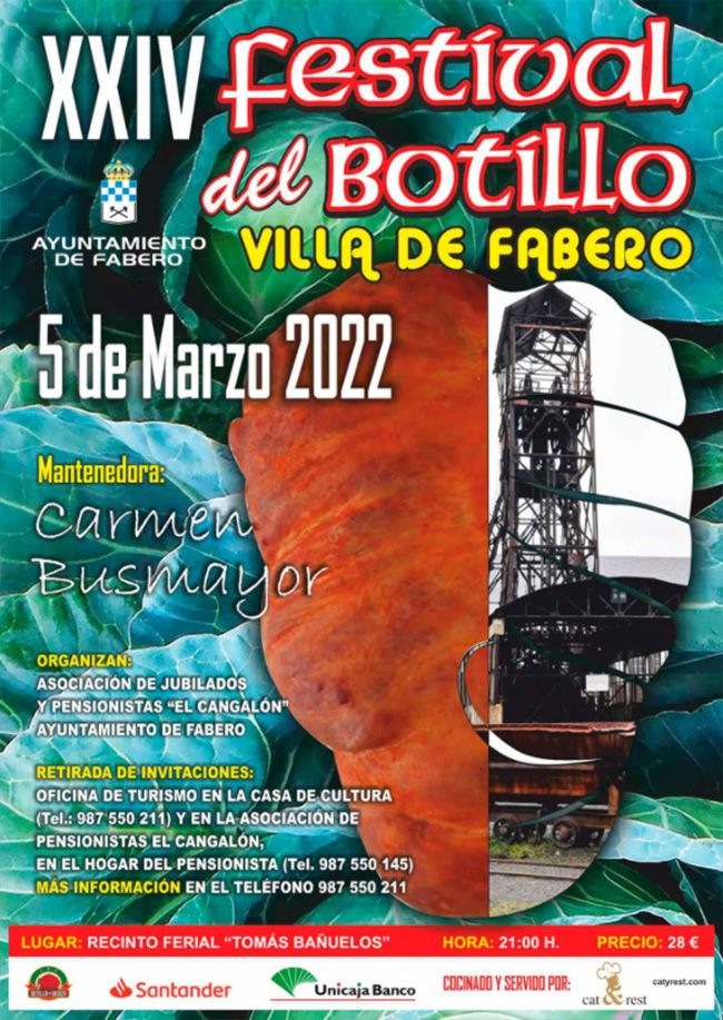 El evento será a cargo de la Asociación de jubilados y pensionistas “El Cangalón” de Fabero anuncia la celebración del Festival del Botillo el próximo sábado 5 de marzo. El Recinto Ferial “Tomás Bañuelos” será el lugar del evento, dará inicio a las 21:00 y tendrá un precio de 28€. La mantenedora será Carmen Busmayor y las invitaciones se pueden obtener en la Oficina de Turismo en la casa de la Cultura y en la asociación El Cangalón