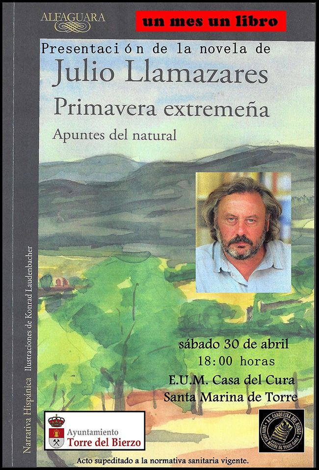El escritor leonés Julio Llamazares presenta este sábado en la localidad berciana de Santa Marina de Torre su última novela ‘Primavera extremeña. Apuntes del natural’, un libro escrito durante los primeros meses de la pandemia, cuando el autor tuvo que permanecer confinado en un lugar de la sierra de los Lagares, cerca de la localidad de Trujillo (Cáceres). Las palabras de Llamazares se acompañan con evocadoras acuarelas de su amigo y vecino Konrad Laudenbacher.