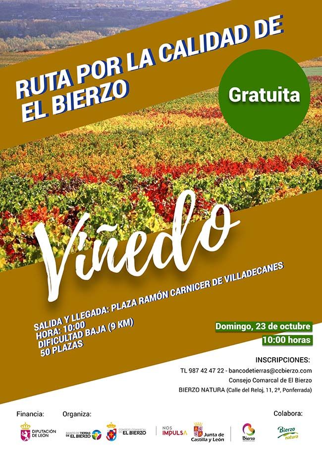 El Banco de Tierras del Consejo Comarcal organiza, en colaboración con el Consejo Regulador de Denominación de Origen Bierzo, la Ruta por la Calidad dedicada al viñedo. Se celebrará el domingo 23 de octubre, a las 10.00 horas, con un nuevo itinerario.