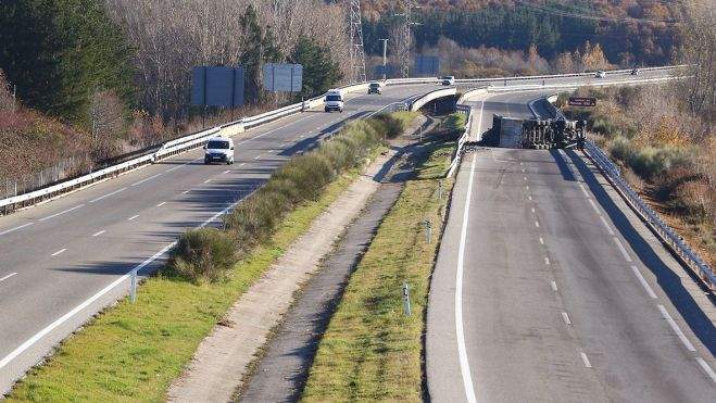 Un camión sufre un accidente en la autovía A6 a su paso por Bembibre, cortando la carretera sentido Madrid