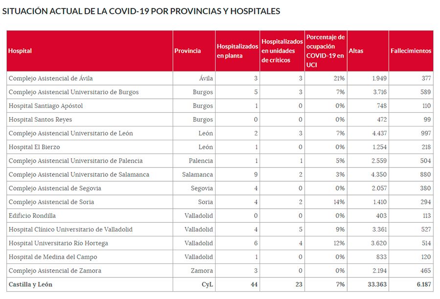 Por lo que respecta a las muertes, la mayoría se produjeron en los hospitales de las provincias de Valladolid (1.274), León (1.215), Salamanca (880) y Burgos (798), mientras que Palencia notificó 504 decesos; Zamora un total de 465; Segovia acumula 380; Ávila suma 377 y Soria, 294 fallecimientos por el COVID-19.