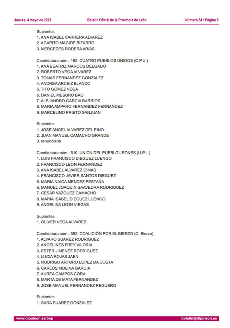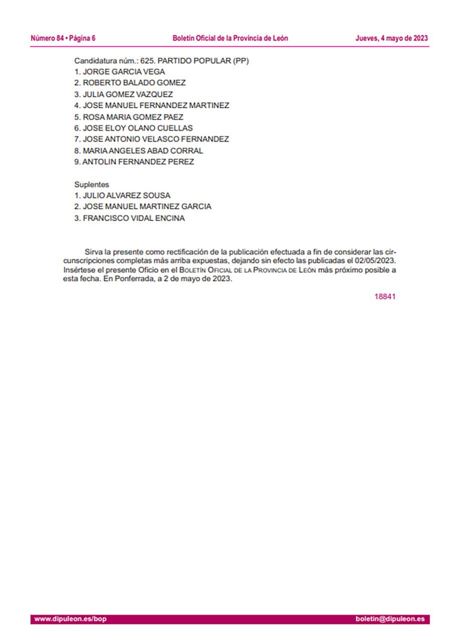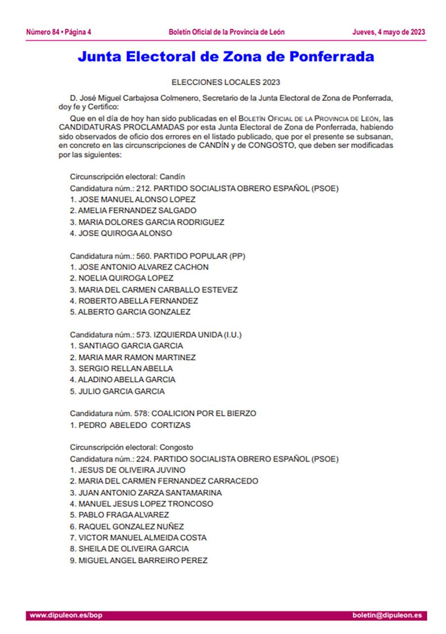 En la misma línea de subsanación en circunscripciones, Congosto también se ha visto inmersa en errores dentro de las ya listas proclamadas, por lo que sus modificaciones finales firmadas por el Secretario de la Junta Electoral de la Zona de Ponferrada, ya aparecen en el BOP de este 4 de mayo.