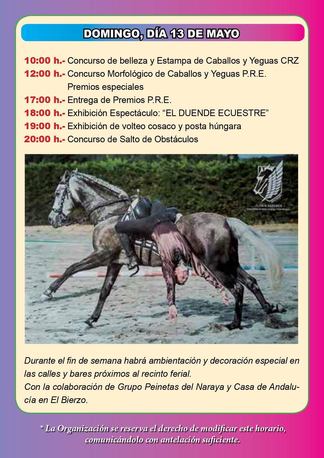 Por parte del Club Hípica del Bierzo, con sede en el municipio, tres de sus jóvenes jinetes protagonizarán el sábado un número de paso a tres. Además, los alumnos de la escuela ecuestre se encargarán de cerrar el evento con un concurso de saltos de obstáculos en el que los pequeños jinetes locales podrán demostrar sus progresos ante el público.