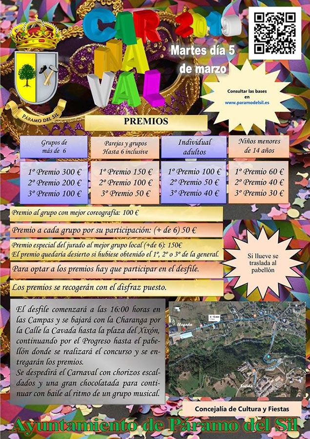 Las inscripciones podrán realizarse hasta el 28 de febrero en el Ayuntamiento o en el teléfono 987568619. En cuanto a los premios, se repartirán en categorías infantil (individual,parejas y grupos), adulto (individual, parejas y grupos) y carrozas, además de premio al grupo local no premiado y al grupo más marchoso. *En caso de suspenderse, se celebrará el domingo 24 de marzo.