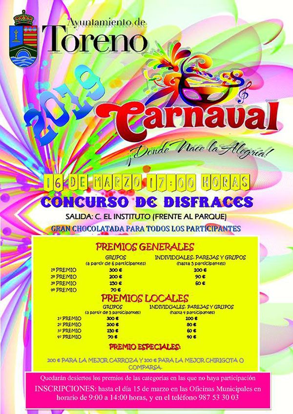 TORENO: Toreno celebrará su desfile de Carnaval el próximo sábado 16 de marzo a las 17:00h. Habrá concurso de disfraces durante el desfile que saldrá de la calle El instituto (frente al parque) con premios para grupos e individuales o parejas. Las inscripciones se realizarán en las oficinas municipales de 9 a 14 horas.