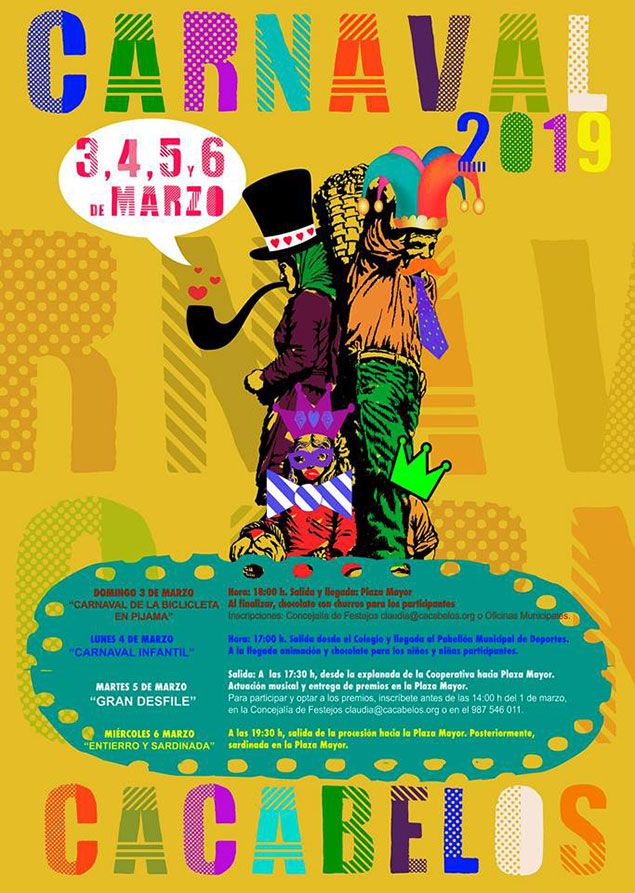 CACABELOS: La villa del Cúa acogerá su tradicional desfile de Carnaval el martes 5 de marzo a partir de las 17:30 horas. La salida será desde la explanada de la Cooperativa y la llegada a la Plaza Mayor, donde habrá una orquesta para el disfrute de todos los asistentes y se entregarán los premios del desfile.