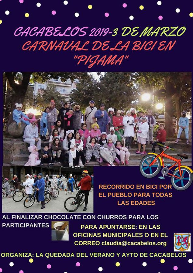 CACABELOS: El domingo 3 de marzo, Cacabelos celebrará el 'Carnaval de la bici en Pijama'. Con salida desde la Plaza Mayor, todos los participantes recorrerán el pueblo en bici. Al finalizar habrá chocolate con churros. Las inscripciones se deben realizar o en las oficinas municipales del Ayuntamiento o en el correo claudia@cacabelos.org.