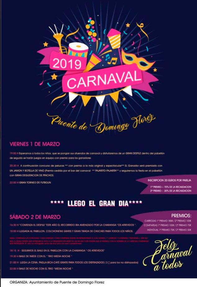 PUENTE DE DOMINGO FLÓREZ: Puente de Domingo Flórez celebra el sábado 2 de marzo su tradicional desfile a las 16:30 horas amenizado por la charanga Os Atrevidos. Habrá premios para las carrozas, comparsas e individual. A la llegada al pabellón habrá colchonetas gratis y gran tirada de chuches para todos los niños. El baile continuará a las 19:30 horas con el trío Media Noche. A las 21:00 horas paella, bica y café gratis para todos los disfrazados. Para los que no estén disfrazados, el precio es de 3€. La fiesta continuará con el pase de noche del trío musical.