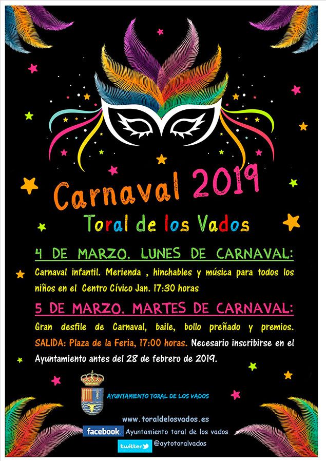 Cabe destacar que el Martes 5 de Marzo, si las condiciones climatológicas no son favorables, todas las actividades se trasladarán al Pabellón Municipal de Deportes de Toral (Calle El Lago). Para participar en el desfile del Martes 5 de Marzo y optar a premio, es necesario inscribirse y recoger el dorsal en las oficinas del Ayuntamiento hasta el 28 de Febrero de 2019. Una misma persona no podrá inscribir a más de un grupo.