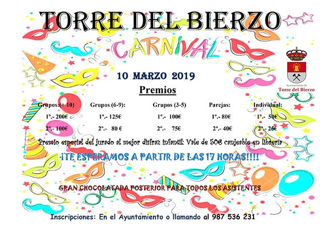 TORRE DEL BIERZO: El Ayuntamiento de Torre del Bierzo celebrará el próximo día 10 de marzo de 2019 el desfile y concurso de Carnaval. Comenzará a las 17:00h y