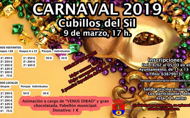 CUBILLOS DEL SIL: El desfile de Carnaval será el 9 de marzo a las 17.00 horas. La salida será desde las piscinas municipales y los participantes deberán estar allí una hora antes. El periodo de inscripciones estará abierto desde el 18 de febrero hasta el 5 de marzo en el Ayuntamiento de 11 a 13 horas, llamando al 638799132 o enviando un correo electrónico a fiestayturismo@aytocubillosdelsil.com. En cuanto a los premios, habrá para grupos de más de 18, grupos de 6 a 17, parejas e individuales en Grupos visitantes y para grupos, parejas en individuales en grupos locales. Además habrá un premio especial a mejor carroza (150€), mejor coreografía (100€) y dos especiales del jurado (75€). La fiesta final será en el pabellón municipal con animación usical a cargo de Venus Dibao y gran chocolatada (1€). *Si el tiempo no acompaña se aplazará al sábado 23 de marzo.