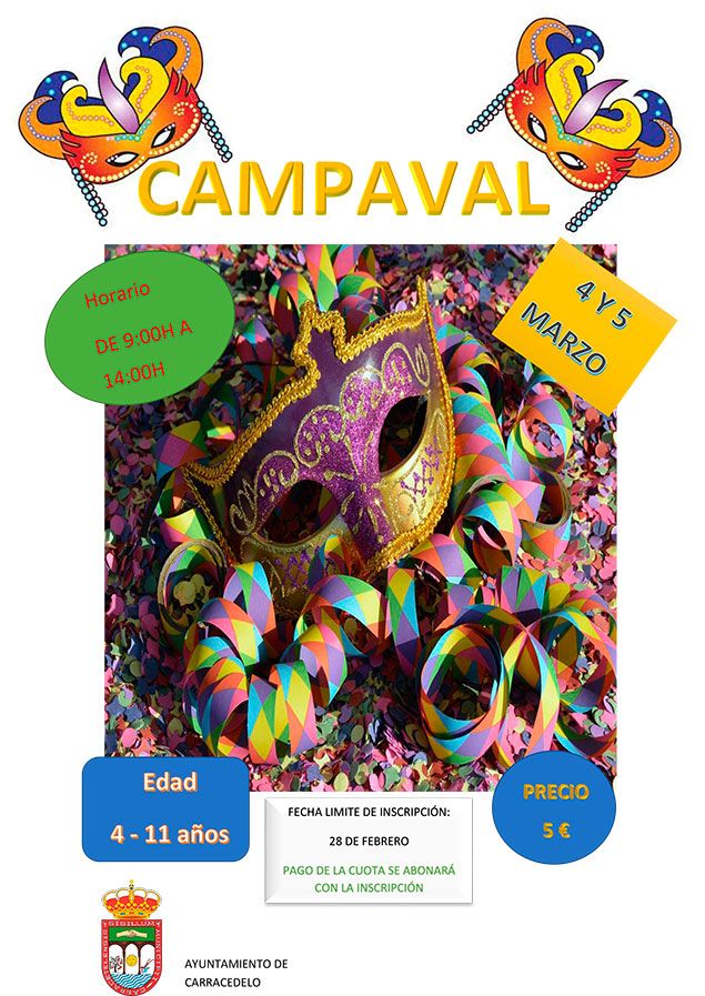 CARRACEDELO: Durante los días 4 y 5 de marzo se celebra en Carracedelo el Campamento de Carnaval de 9:00 a 14:00 horas para todos los niños entre 4 y 11 años. El precio es de 5 euros y el periodo de inscripción en la oficina municipal ya está abierto hasta el 28 de febrero.