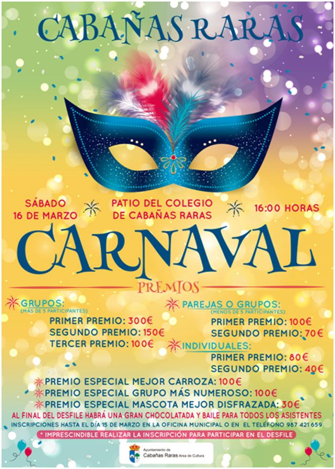 El próximo 16 de marzo, a las 16 horas en el patio del colegio de Cabañas Raras, se celebra el tradicional carnaval organizado por el Ayuntamiento de Cabañas Raras.