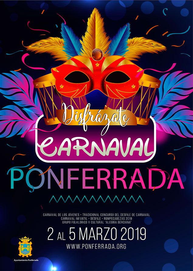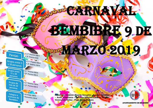 BEMBIBRE: La capital del Bierzo Alto celebrará el desfile de Carnaval el sábado 9 de marzo a las 17.00 horas. Las inscripciones deberás realizarse antes del 23 de febrero en el Ayuntamiento de Bembibre (2ª planta) o llamar al teléfono 987510001 (en horario de mañana, de 9 a 14 horas, preguntando por Araceli). Recorrido: Estación puente Socuello-Juan XXIII- Avda. Villafranca- Emiliano Sánchez Lombas- Veremundo Núñez- Plaza Santa Bárbara. Fin de Fiesta con la orquesta “Suavecito".