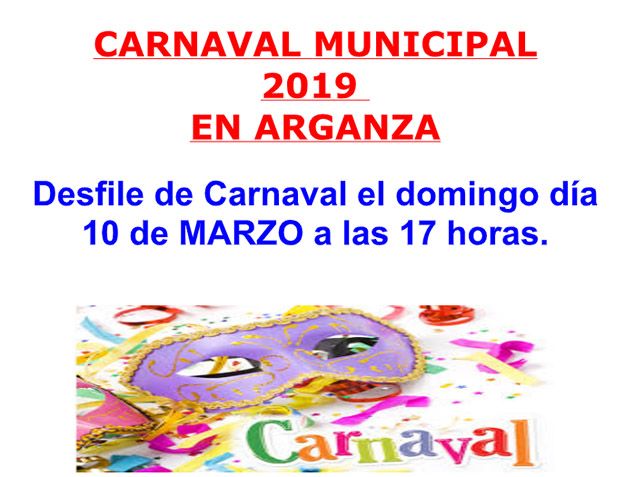 ARGANZA: El desfile de Carnaval se celebrará el domingo 10 de marzo a partir de las 17.00 horas. La salida será desde la plaza del pueblo y al finalizar habrá baile y chocolatada en el edificio sociocultural. Se subvencionará la participación de todos los grupos de 4 o más participantes, además de entregar premios al mejor disfraz individual adulto y mejor disfraz individual infantil. Los grupos que quieran participar pueden inscribirse hasta el 6 de marzo en el Ayuntamiento de 10 a 14 horas o llamando al 987553306.
