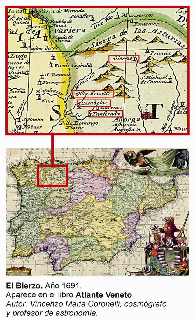 En 'Atlante Veneto', ya figura una Comarca del Bierzo, pero con una peculiaridad. 'Vierzo', con uve, hace su 'aparición' en la historia de la Cartografía ya dentro de una Región Leonesa, claramente diferencia de Galicia. La evolución de este mapa se puede observar en la representación de los ríos Burbia y Sil. Además, Cacabelos, Ponferrada y Puente de Domingo Flórez acompañan a una Villafranca, aún sin apellido, en 'Atlante Veneto'.