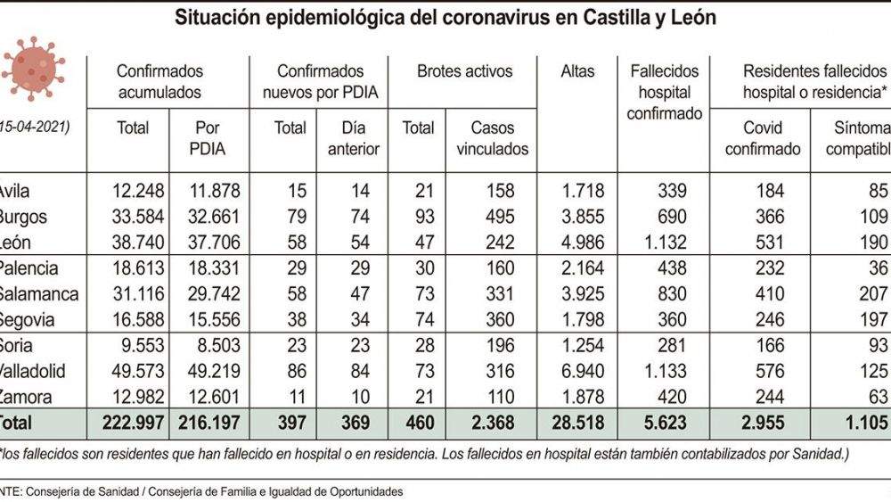 Con estas cifras, la Comunidad acumula 222.997 personas infectadas, con Valladolid, León, Burgos y Salamanca a la cabeza, con 49.573, 38.740, y 33.584 y 31.116, respectivamente. Asimismo, hay 18.613 confirmados en Palencia; 16.588 en Segovia; 12.982 en Zamora; 12.248 en Ávila; y 9.553 en Soria.