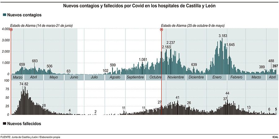 Los nuevos contagios por COVID-19 siguen instalados en Castilla y León en los 400 casos. La Comunidad anota este jueves 397 nuevas infecciones, dentro de la tendencia experimentada a lo largo de la pasada semana y que comienza a arrojar los efectos de la Semana Santa. Los datos de la Consejería de Sanidad recogidos por Ical añaden hoy cinco muertes más, todas en hospitales, y elevan el número de fallecidos en estos centros a lo largo de la pandemia a los 5.623. De forma paralela, aumentan las altas, con 56 nuevos pacientes que salieron de los hospitales en la última jornada.