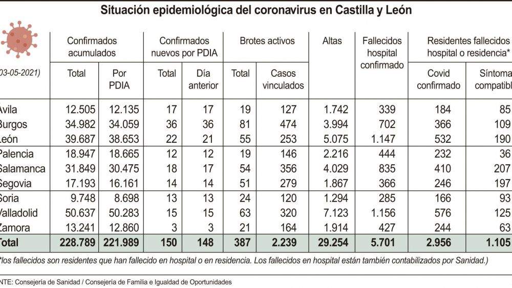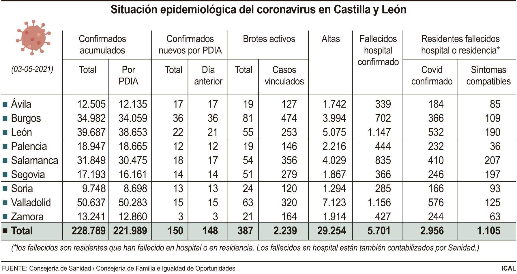 En cuanto a los fallecidos, en total, y hasta este domingo, perdieron la vida en hospitales por el virus 5.701 personas. Así se contabilizó una muerte más en Valladolid, por lo que la cifra sube a 1.156; Burgos, hasta un total de 702, y León, hasta un total de 1.147. En el resto se mantuvieron sin cambios: Ávila (339), Palencia (444), Salamanca (835), Segovia (366), Soria (285) y Zamora (427).