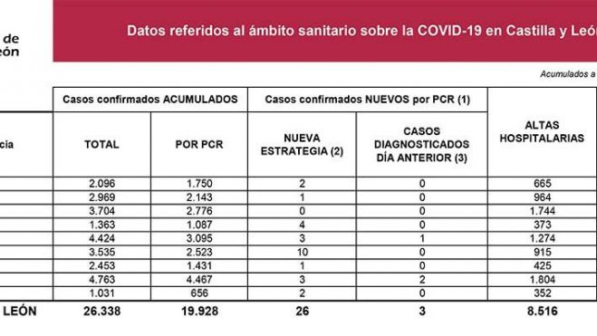 De los tres casos, uno corresponde a la provincia de Salamanca y dos a la de Valladolid. En total, el volumen acumulado de positivos por COVID-19 contabilizados en Castilla y León desde el inicio de la pandemia, incluyendo las pruebas realizadas por PCR y test de anticuerpos, asciende en estos momentos a 26.338, de los que 19.928 se confirmaron mediante PCR.