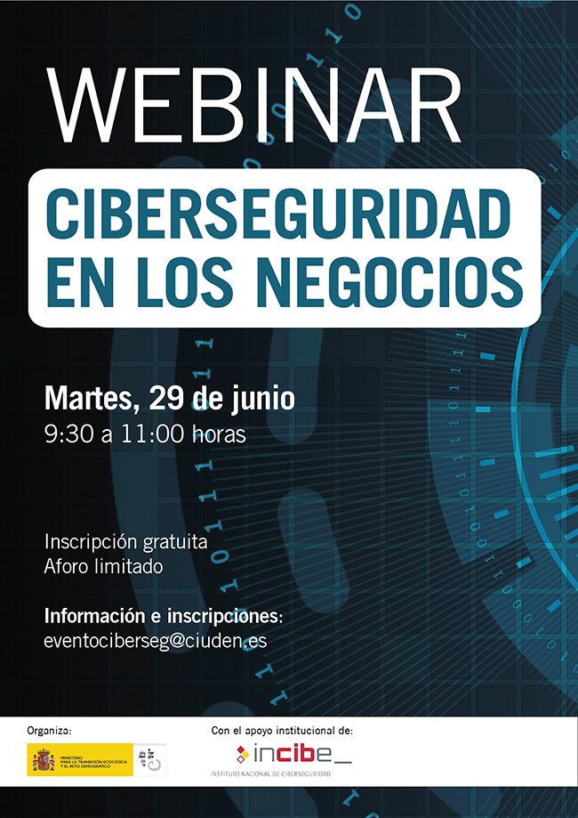 La Fundación Ciudad de la Energía (CIUDEN), con el apoyo institucional del Instituto Nacional de Ciberseguridad (Incibe), organiza el próximo martes 29 el seminario web informativo ‘Ciberseguridad en los negocios’, dirigido a pymes a y autónomos, que busca facilitar un mejor conocimiento sobre lo que significa la ciberseguridad y cómo pueden afectar a los negocios las distintas amenazas que surgen en la transformación digital de la sociedad.