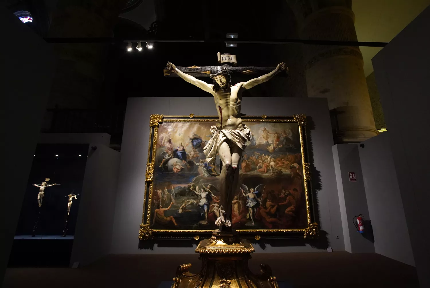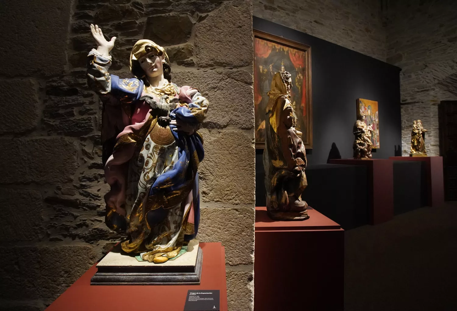 La visita continua en la Colegiata, que alberga 110 piezas llegadas desde diferentes puntos, como la Diócesis de Astorga, la Archidiócesis de Burgos, la de Valladolid, la Diócesis de León, Zamora u Orense, que cede a Villafranca para esta ocasión una importante pieza de alabastro chino-filipino que se guarda en la localidad de Celanova. También se puede ver ‘La visión de San Francisco’ de El Greco, que llega desde la Diócesis de Cádiz o estatuas del prestigioso escultor Luis Salvador Carmona. La muestra se estructura allí en cuatro estancias principales (vinculadas con la letra, la alegoría, el sentido moral y la anagogía), más el Preludio y los testimonios finales.