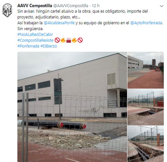 La Asociación de Vecinos de Compostilla no ha demorado su respuesta. A través de twitter, han denunciado que las obras se hayan iniciado "sin avisar". "Ningún cartel alusivo a la obra, que es obligatorio, importe del proyecto, adjudicatario, plazo, etc... Así trabajan la Alcaldesa de Ponferrada y su equipo de Gobierno. Sin vergüenza", reza el texto que han lanzado a través de las redes sociales.
