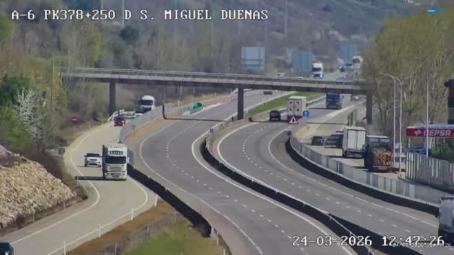 La autovía A-6 permanece cortada en la mañana de este martes 24 de marzo a su paso por San Miguel de las Dueñas, en sentido A Coruña, debido a las labores de retirada de un camión accidentado en el kilómetro 380.