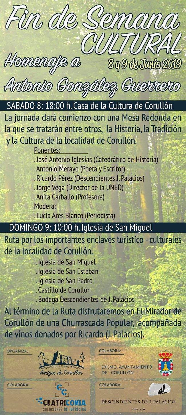Corullón celebrará los días 8 y 9 de junio el Fin de Semana Cultural en homenaje a Antonio González Guerrero, poeta berciano nacido en Corullón, que falleció en el año 2004. Para ello, la Asociación Cultural Municipal Amigos de Corullón ha preparado un fin de semana en su honor que se compondrá de varias actividades.