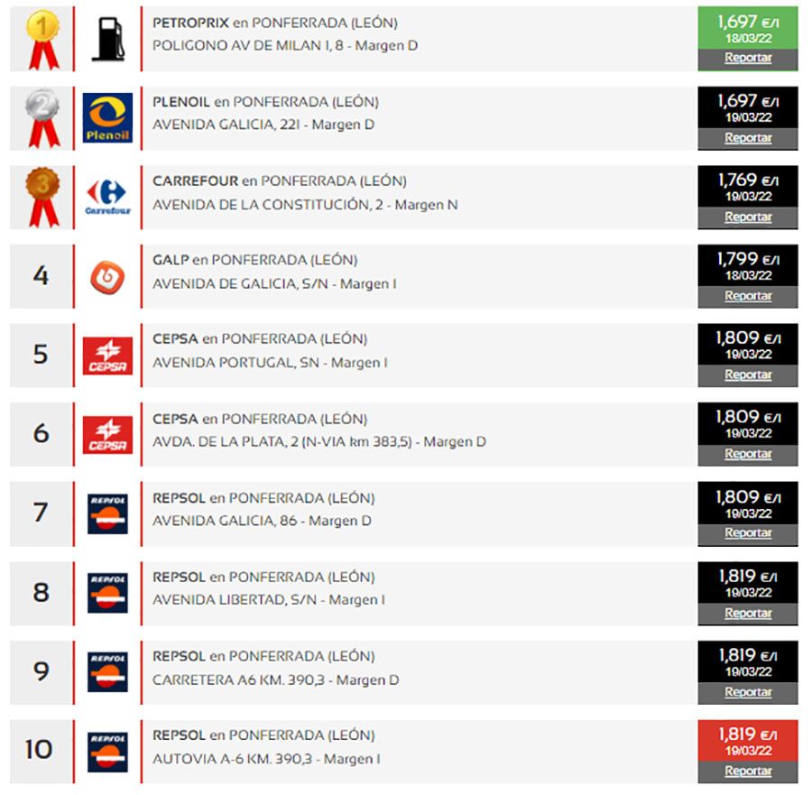 En Ponferrada la gasolinera más barata es la Petroprix, en la Avenida Milán 1, 8 en el Polígono, con un precio de 1,697 euros el litro. En segundo lugar, está la gasolinera Plenoir en la Avenida de Galicia (1,697 euros/litro) y tercera la de Carrefour en la Avenida de la constitución (1,779 euros/litro). La décima más cara de la capital berciana es la gasolinera Repsol de la Calle Montearenas donde repostar gasolina sale a 1,869 euros el litro.